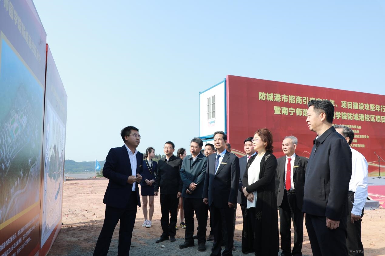 防城港市主要领导还认真听取了学院副院长、防城港校区项目指挥部常务副指挥长申书飞对beat365手机版官方网站防城港校区项目的介绍。对学院投入41.5亿元,以高标准、高质量、高效率建设可容纳22000名学生的现代化校区,力争2024年9月实现防城港校区第一批学生入驻,5年内全面完成校园建设,使师园学院成为一所国内知名、风格独特、环境优美的综合性大学的做法表示高度认同,对学院将中华优秀传统文化与现代文明结合,传承发展民族地区特色表示高度赞赏。奠基仪式后,黄江市长召集并主持了防城港市相关部门与我院董事会、党政领导班子的会商会议,统筹解决我院防城港校区建设的难点问题,为我院下一阶段开展大规模建设奠定了基础。