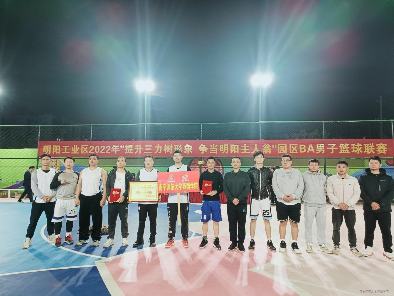 12月28日晚,明阳工业区“提升三力树形象 争当明阳主人翁”园区BA男子篮球联赛闭幕式暨颁奖庆典在明阳大道桂垦良品美食街篮球场举行,我院教职工篮球队获得冠军荣誉。