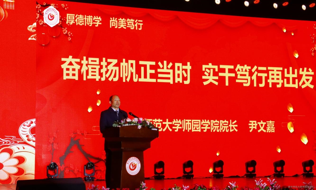 尹文嘉院长发表2025年新年致辞,向全校广大教职工,全体同学以及关心和长期支持学院发展的社会各界朋友表达最真挚的祝福与崇高的敬意。尹文嘉院长指出,回顾2024年,学院始终坚持以习近平新时代中国特色社会主义思想为指导,全面落实立德树人根本任务,持续深化教育教学创新改革,在完善基础设施建设、科学研究、学科竞赛、招生就业、志愿服务等方面取得了喜人成绩:一是初心如磐强基建,实干笃行日日新。防城港校区第一期工程预计2025年9月一期工程可竣工,届时将成为防城港市一张亮丽的名片;学院投入500多万元进行提质工程,对校内场所、设施设备进行优化,进一步完善了广大师生工作、学习、生活和发展的校园环境。二是披星追梦勤耕耘,同心砥砺谱新曲。学院新增教学科研成果省部级与市厅级立项42项,教学科研工作取得良好成效。三是厚积薄发勇争新,淬火成钢创佳绩。2024年学院共斩获各类学科竞赛奖项252项,高质量完成学院“十四五”发展规划的相关要求。四是谋定而动启新篇,凝心聚力获殊荣。学院招生就业工作乘风破浪,续写新篇章,其中招生质量得到显著提高,就业工作推动毕业生去向落实率稳中有升并荣获“2024年度全区普通高等学校毕业生留桂就业工作贡献突出单位”称号。五是志愿服务助成长,笃行不怠育新人。学院积极组织学生参加广西大学生志愿服务西部计划活动、东润体育足球公益项目、寒暑假“返家乡”社会实践活动、姚基金希望小学篮球季、美丽乡村足球季项目等公益活动,为公益事业发展贡献青春力量。最后,尹文嘉院长希望,2025年学院全体师生以教育家精神为引领、以教育教学工作为中心、以提升教学质量为生命线、以德育工作为先导、以促进同学们的健康成长为主旨,坚持立德树人,提升人才培养质量,加强教师队伍建设,大力推进学院转设工作,加快推进防城港校区建设进度,持续优化育人环境;坚持依法治校,提升学院综合治理水平,为实现将学院建设成为特色鲜明、区域领先、国内具有一定影响力的应用型本科高等院校这一目标勇毅前行!