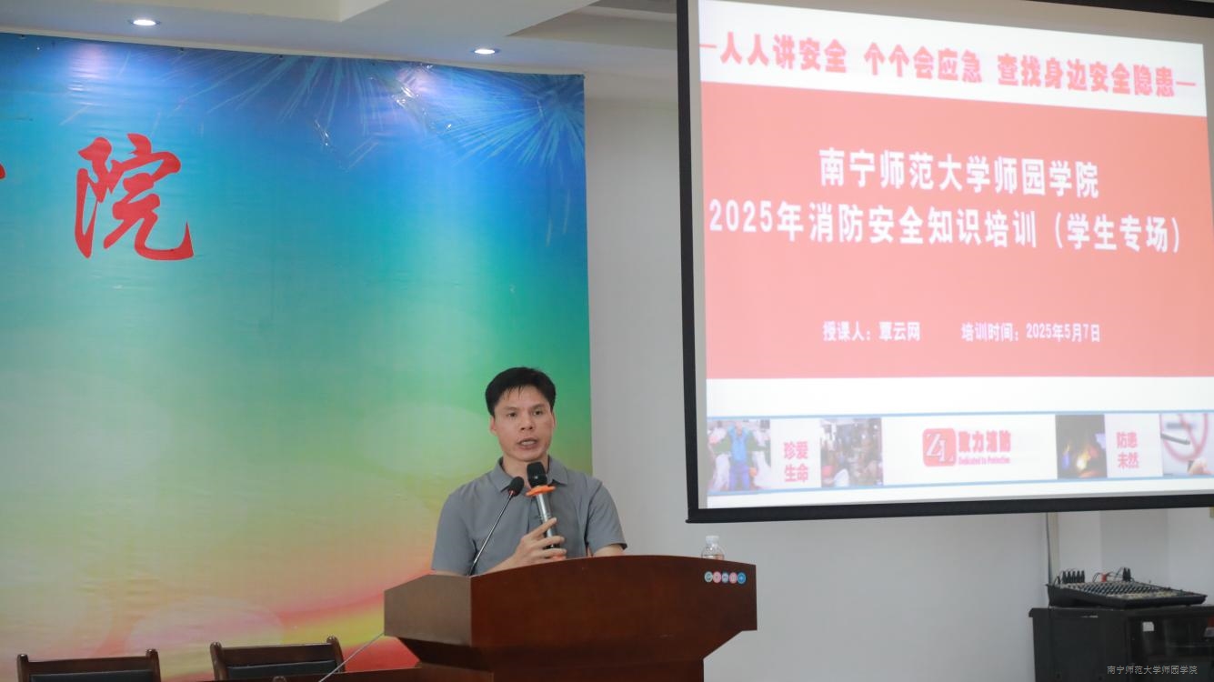 为进一步增强消防安全意识和技能,我院于5月7日下午在图书馆6楼第一报告厅召开2025年消防安全知识培训讲座。致力消防覃教官应邀主讲。学院保卫处处长苏琳、各系辅导员及各系250名学生代表共同参加讲座。